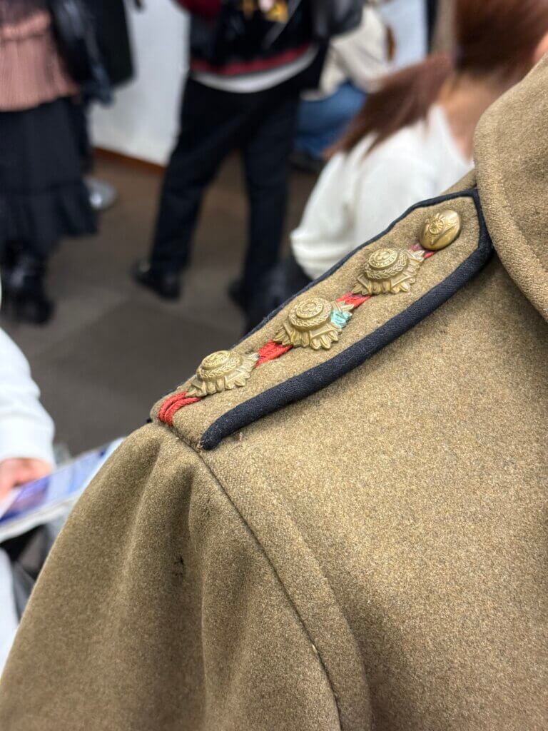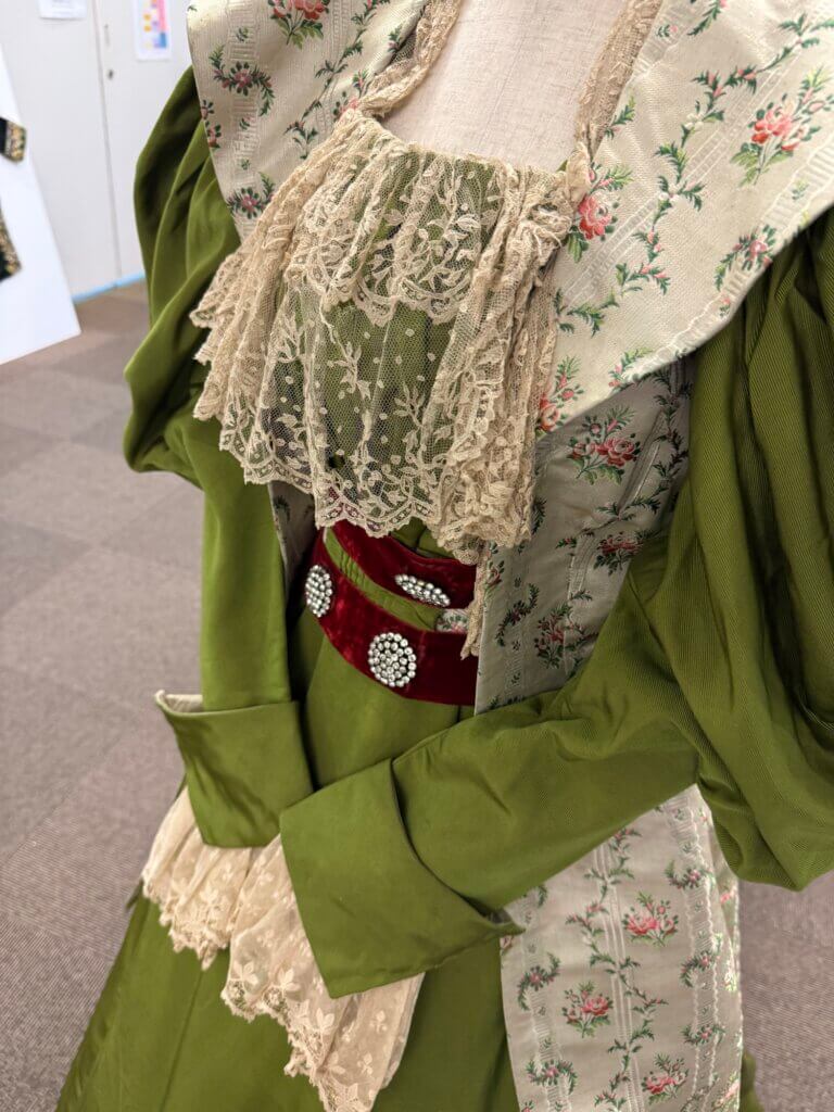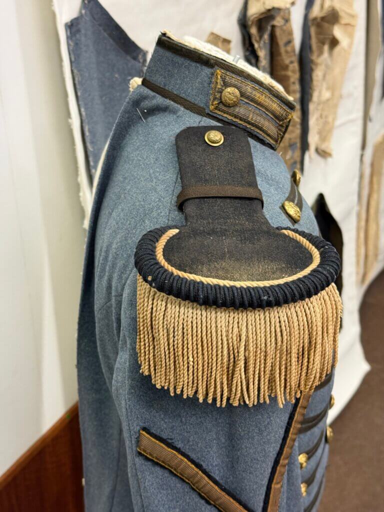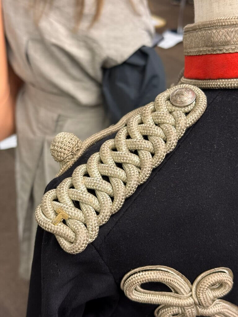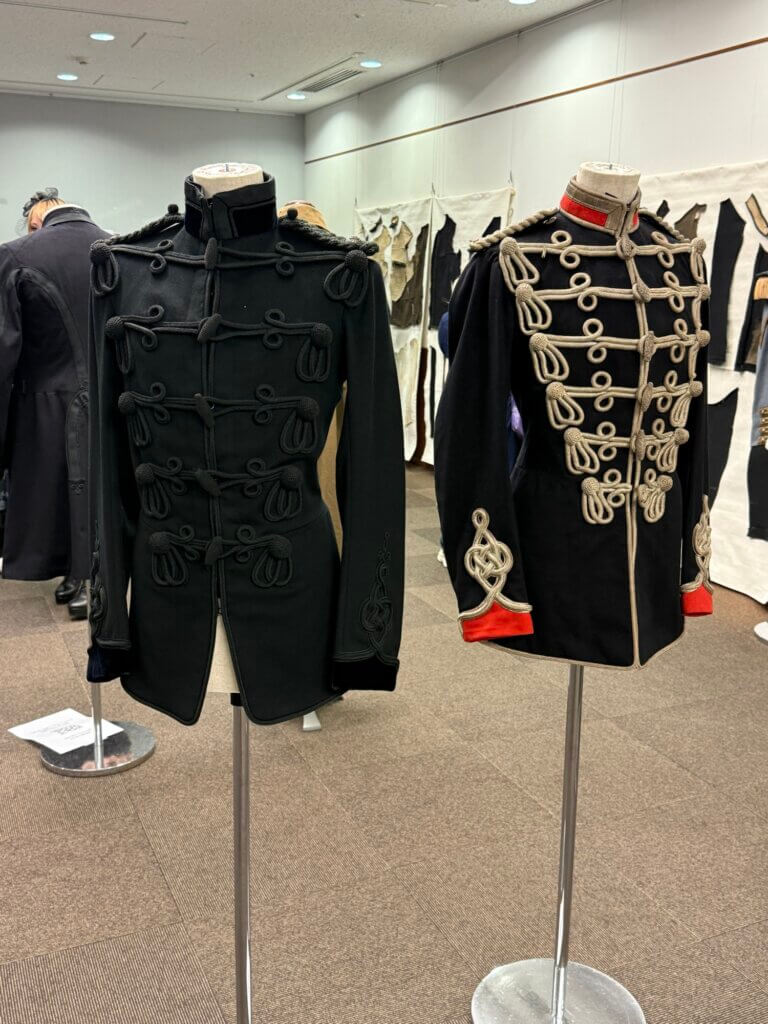 例えば軍服。このコードを上手いこと装飾にしつつ、胸部の護りにしてるのすごいよね。あとこんなにウエストキュッてしてたら動きづらくないのだろうか……と思ったりしました。袖口のコードの刺繍もすごく凝ってる。ちなみにこの、フロントのボタン部分が幅広のテープでできてる、ショールカラーみたいな軍服は、軍医さん用のものだそうです。サイズゆったりめで丈も長めでした。