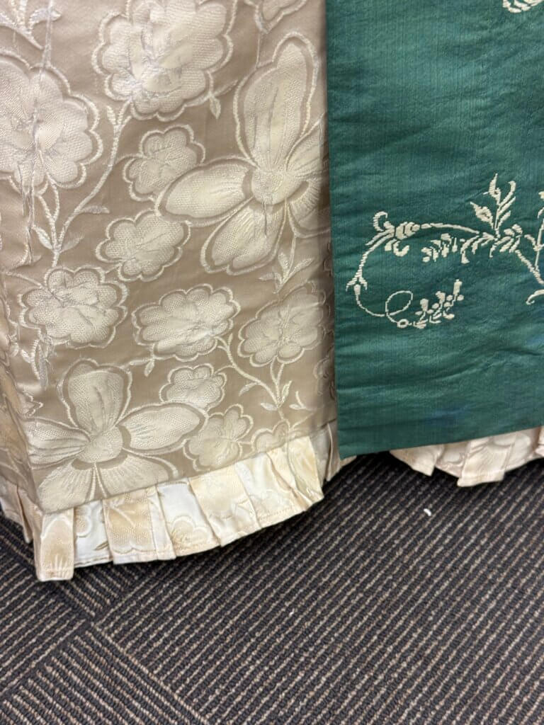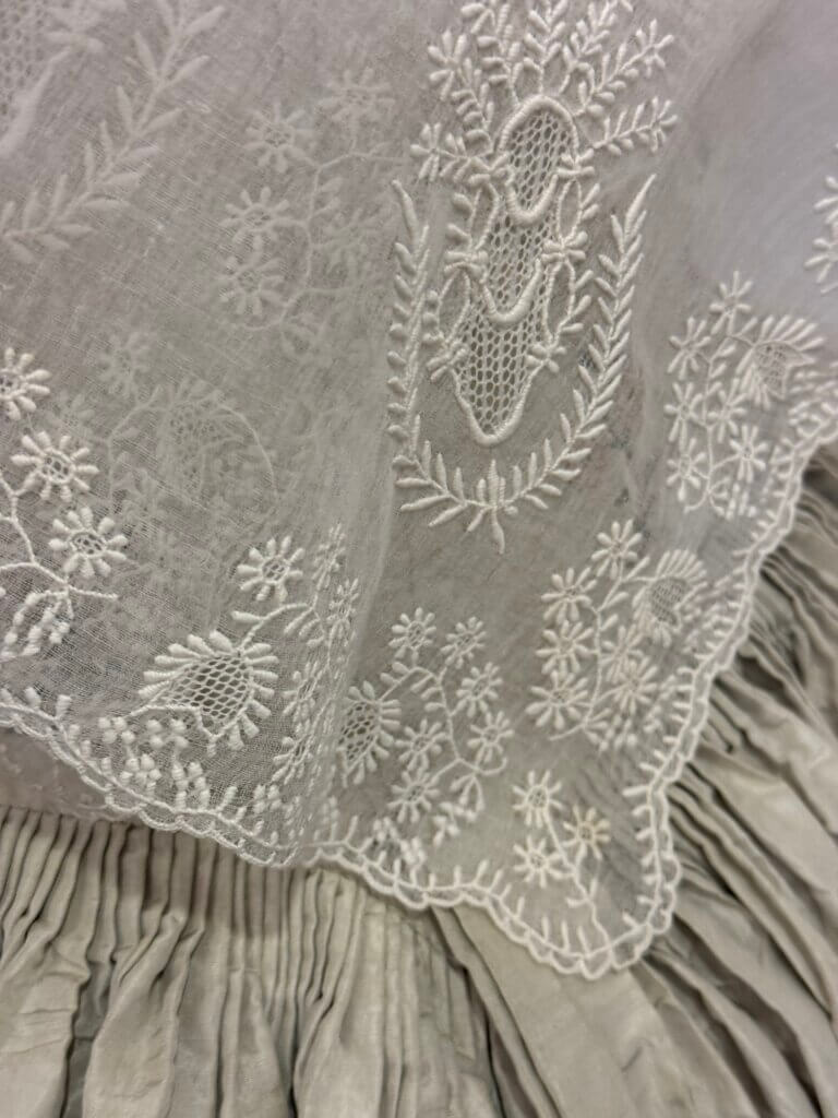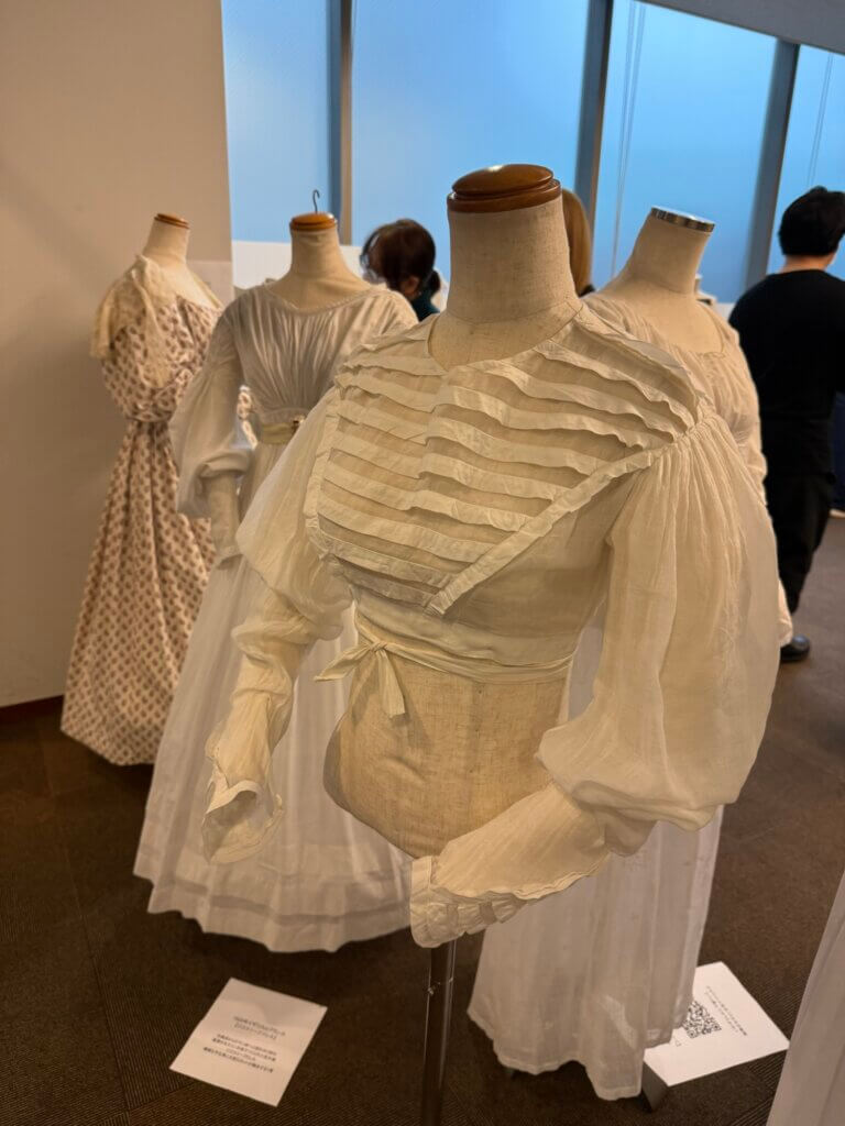 繊細なレースや刺繍、絶対手縫いしたくない細かさのギャザーやピンタック、プリーツ……。19世紀はミシンが基本的に直線縫いのみだった時代だと思うので、全部手でやってるンだよなと思うと気が遠くなりますね。……あと18世紀のドレスは、ミシンないんだよな、と思うとこのスカートの裾の処理を手で……?! と気が遠くなりますね……。
