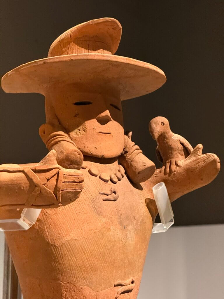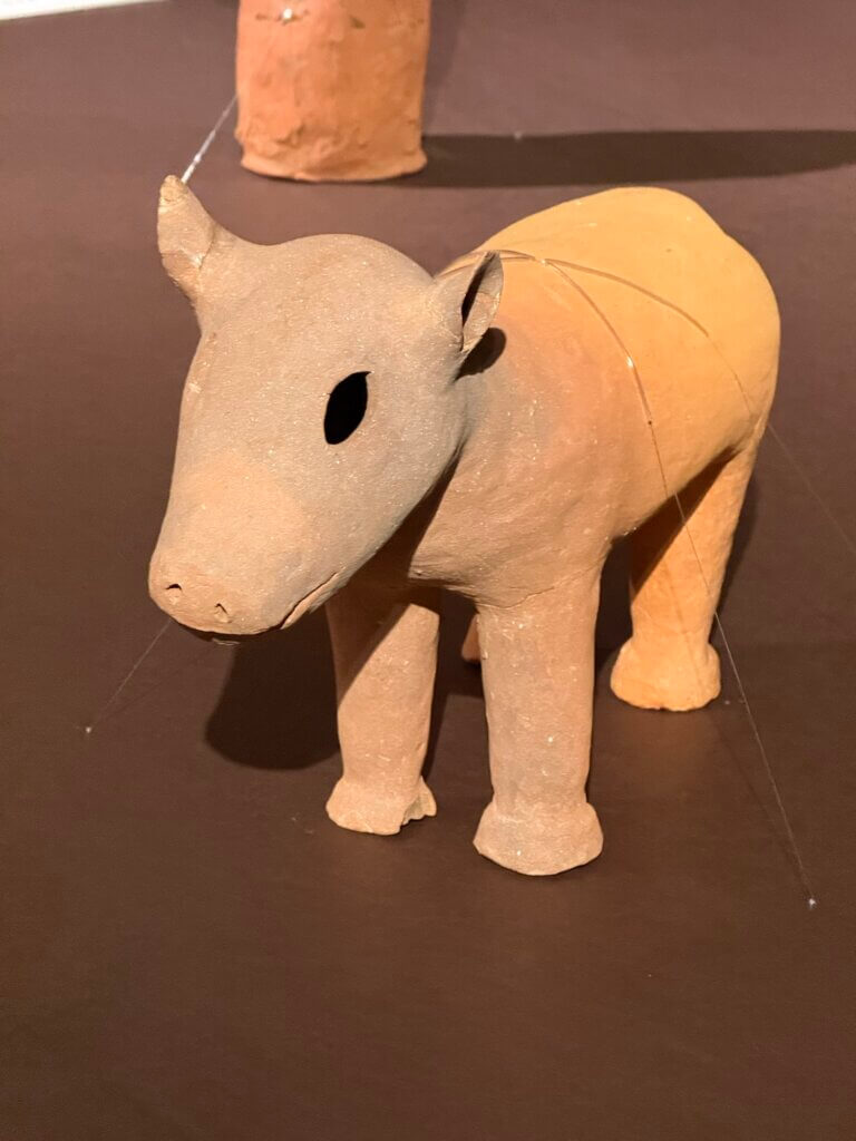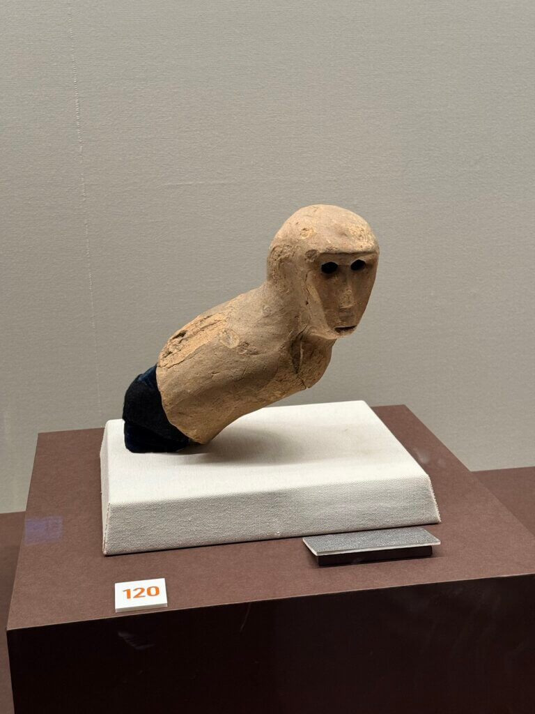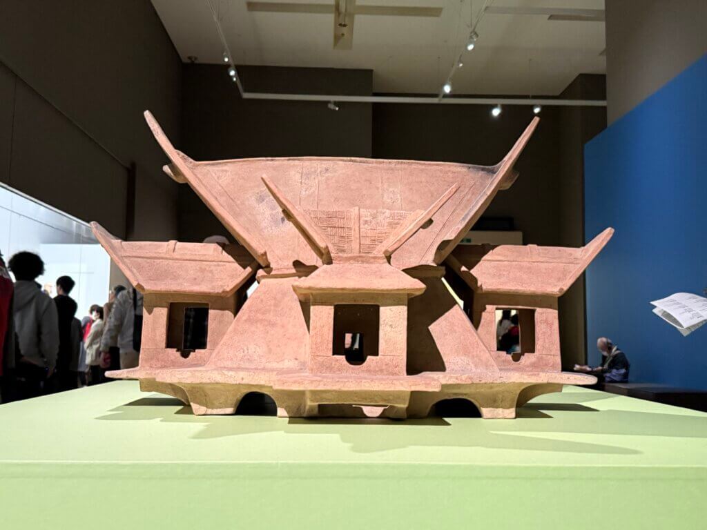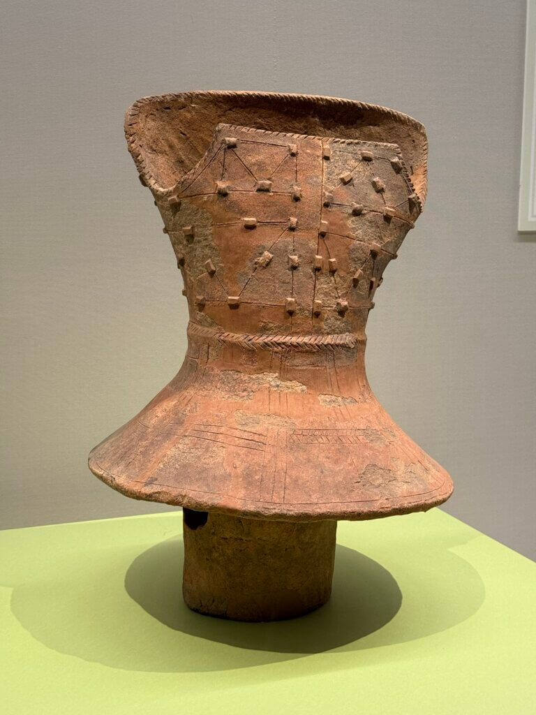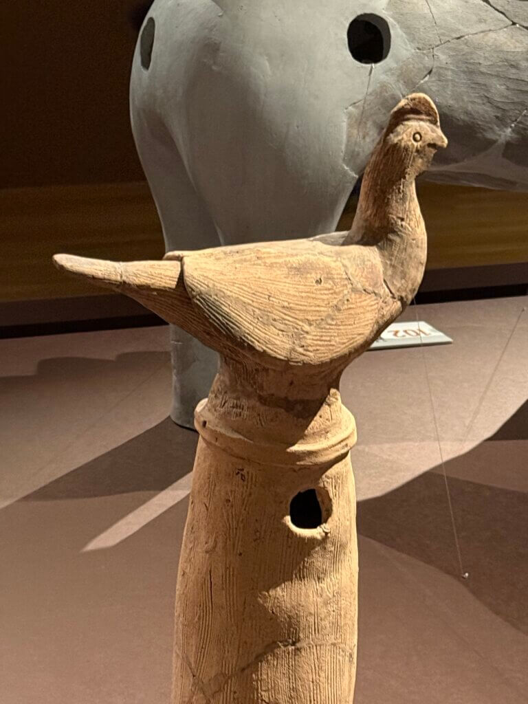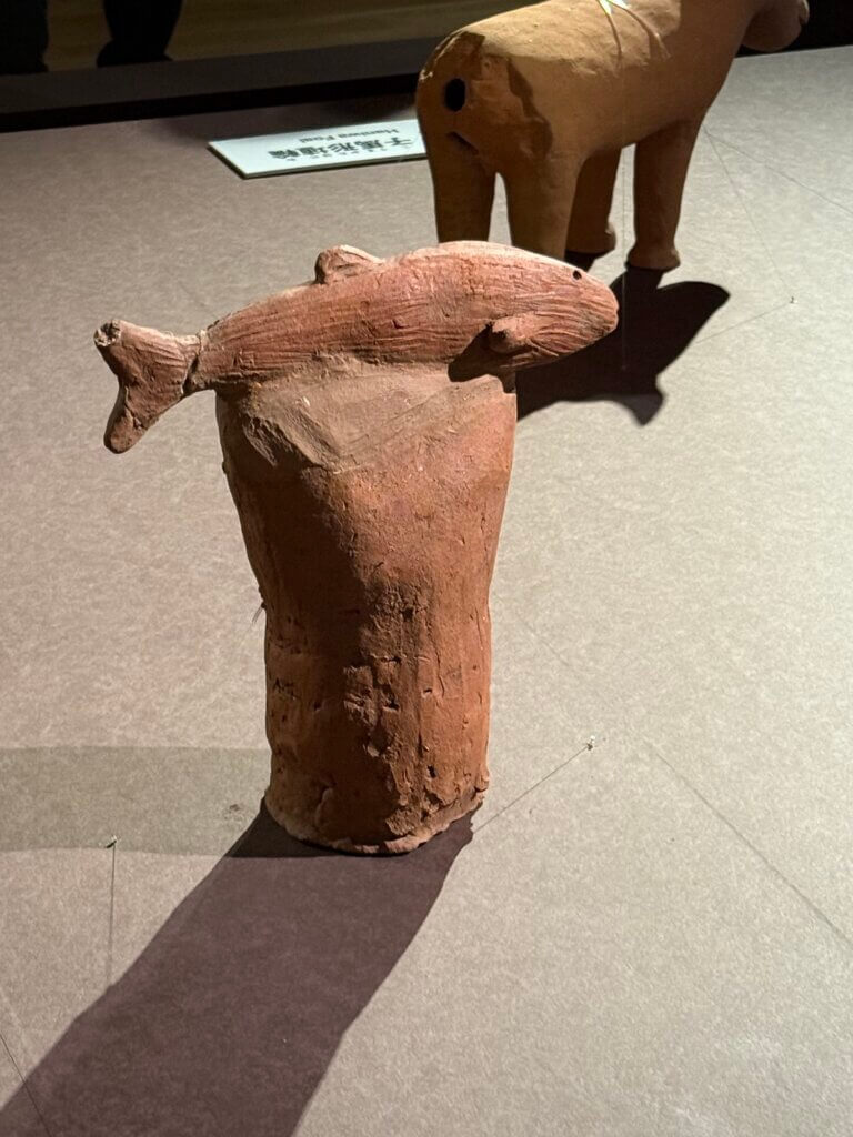 それに、「はにわ」というとどうしてもまず人型を想像しますが、動物の形や家の形、ただの筒(土管みたいだった)や盾の形など、人以外の形のものも大変に多いそうです。ものすごく上手な魚のはにわとか、余りにも可愛らしい水鳥のはにわとかもありました。(水鳥は亡くなった人の魂を運ぶものだと思われていたらしい。古墳に並べられてたものだってことを改めて思い出しました)