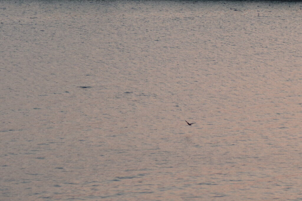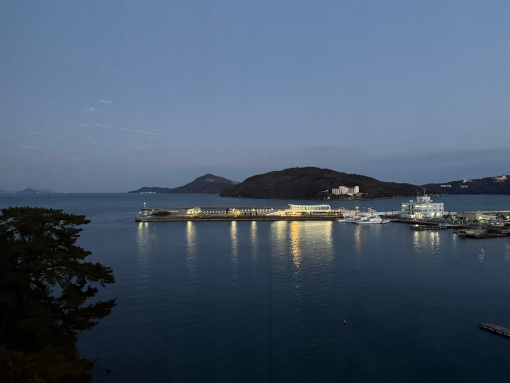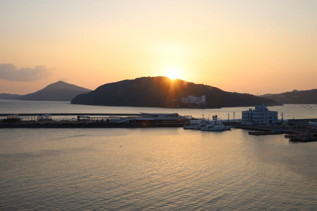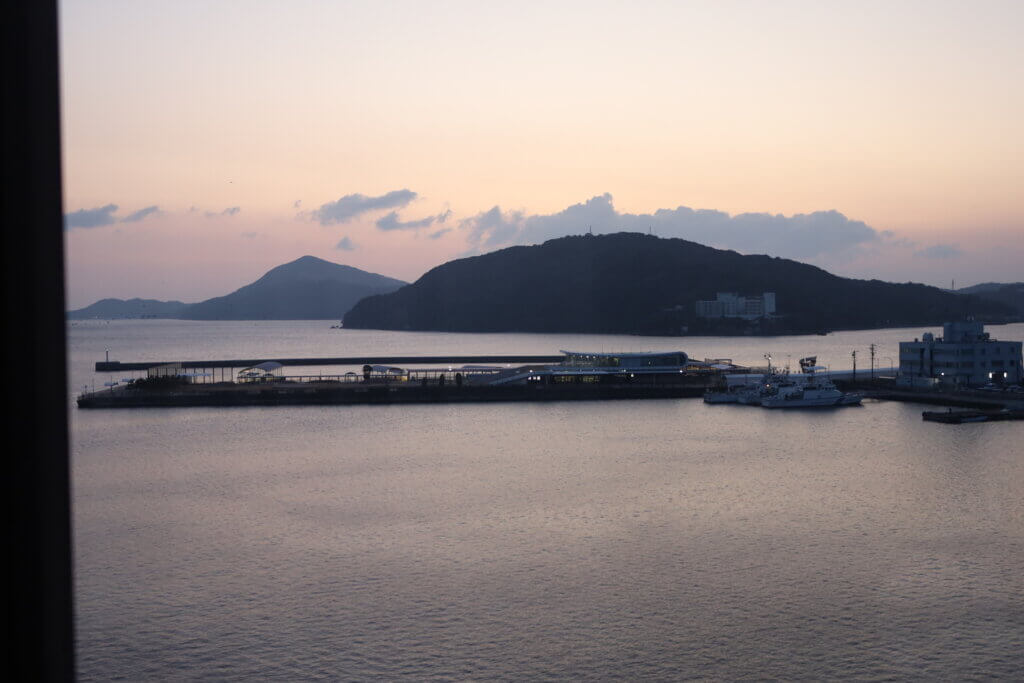 この日はちょっといいホテルに泊まったのですが、向かう道すがら、海で何やらイルカ? のような生き物の背中を見かけて大興奮。ただ、その生き物がなんなのか,その時点ではとんと見当が付かず……。生き物のことは一旦忘れ、ホテルで温泉と美味しい海産、そしてお酒を堪能したのですが、翌朝! ホテルの部屋の外はすぐ海で、朝日が見えて……なんと、その光に照らされて、昨日見たのと同じような背中の生き物が、何匹も泳いでいるのが見えたのです!