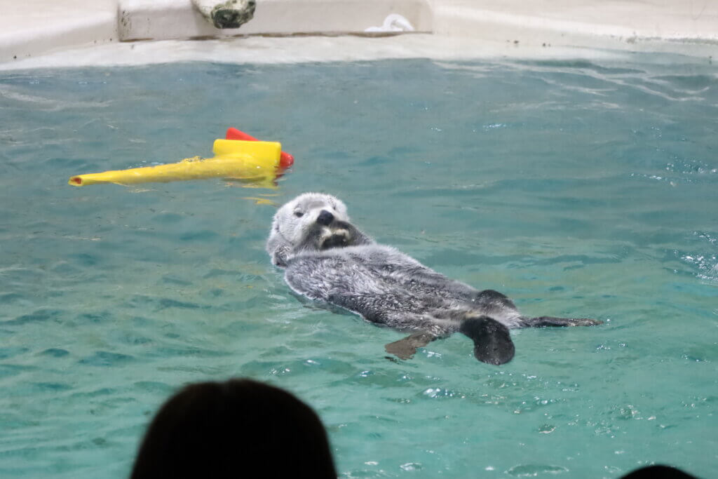 最大の見所で最大の売りなのはやっぱり、ラッコのキラちゃんとメイちゃん。グッズもたくさんあるし、水槽の前は大混雑でした! この旅の翌月から観覧ルールが変わったそうなのですが、この時は並んだり遠くから眺めたりすることで、キラちゃんとメイちゃんを見る事ができました。
