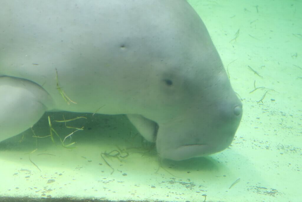 例えば、鳥羽水族館にはラッコ以外にも、ここでしか見られない生き物がいます。ジュゴンです! ちょうどご飯タイムで、水草をもぐもぐするジュゴンを見る事ができました。
