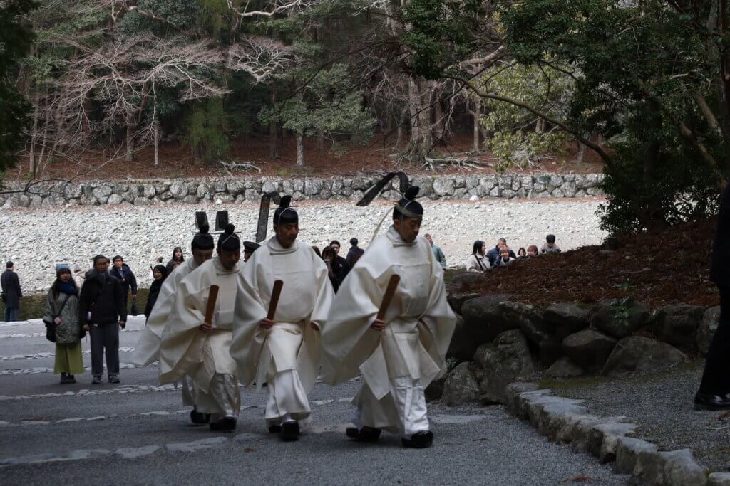 最初は式年遷宮の年で大混雑、次はごく普通(多分……)に参拝し、三度目はうっかり大学駅伝の日で大混雑、そして今回は初めての平日でした。平日ならばきっと空いているだろう! と思ってのことだったのですが……、なんとこの日は祈年祭が。外宮からバスに乗り内宮に着いた頃、丁度神官さんたちが練り歩いている時間帯で、そこそこ混雑していました。